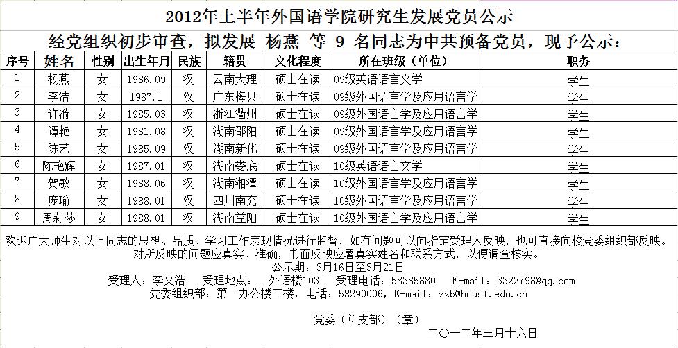 研究生2012年上半年永利3044noc发展党员公示