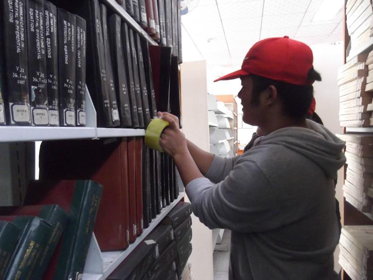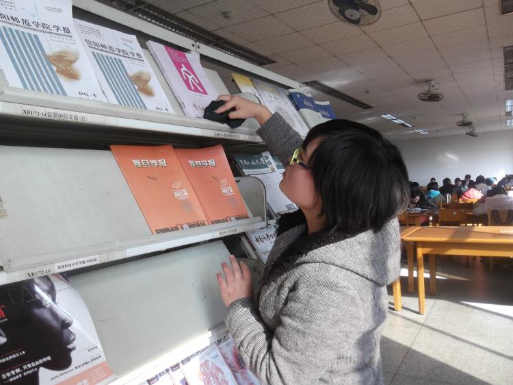此次活动分别在综合期刊阅览室、外文阅览室、古文献阅览室进行。在图书馆管理员详细地介绍了工作内容后,志愿者们便热火朝天地干起来。面对这一本本精装的书籍,志愿者们如捧珍宝,小心翼翼地拂去上面的灰尘,将标签贴在书侧,轻轻压平,再依次排好序,整齐地放入书架。在综合阅览室,三个志愿者忙得不亦乐乎,她们将袖子捋得高高的,踮起脚尖,细心地擦拭着书架上的灰尘。经过三个小时的劳动后,志愿者们的额头上出现了细密的汗珠,当被问及累不累时,她们却纷纷摇头回答:“不累,不累,这是志愿者应该做的,我们很开心。”