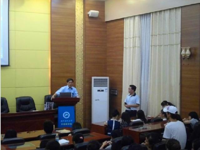 演讲开始前,101会议室座无虚席,甚至连走廊上都站满了拿着笔和纸的热情听众。曾在英国广播公司BBC担任资深记者,在加拿大OMNI TV电视台担任记者兼翻译的的董守良教授在台上将新闻标题翻译的诀窍娓娓道来。董守良教授指出,无论什么翻译首先要注意删减,使得语言精炼传神。在合适的时候,还要在翻译中添加注释性词语,避免歧义。并且还要尽量再现原文的修辞特点,使译文读者获得与原文读者近乎一样的感受。而关于新闻标题的翻译原则也是如此。不过董教授多次强调,“信”才是根本,无“信”无以立“本”。在演讲过程中,董教授还多次将理论与自己的实际体验相结合,令听众们心悦诚服。