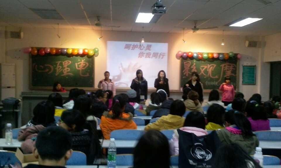活动流程:(1)晚上6:20我部所有成员在外院411多媒体教室集合,先打开教室的多媒体,检查活动需要放映的ppt以及电影文件是否能够正常放映,确保活动的顺利进行。6:45各个班级的心理委员及其参加活动的人员陆续到来,我们的工作人员有序地组织他们签到,此时放一些欢快的音乐,调节氛围。