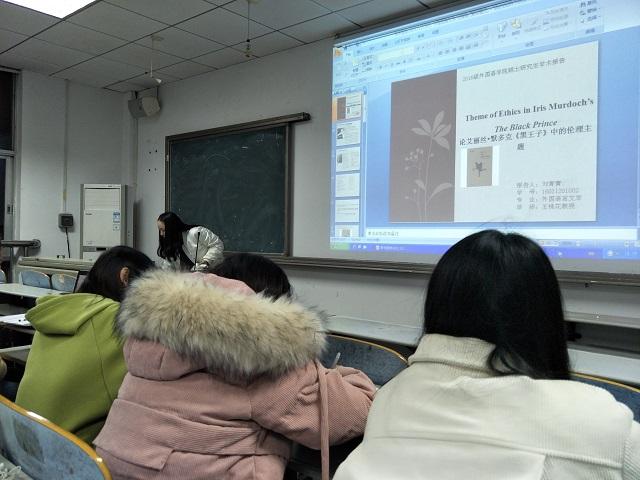 刘青青同学的报告主题为“论艾丽丝·默多克《黑王子》中的伦理道德”。她简单介绍了艾丽丝·默多克的生活经历及其文学成就,然后以《黑王子》为主要文本,借助文学批评理论来探究小说的“伦理”主题,从个人伦理、家庭伦理、社会伦理的视角出发,反映现代人在生存和信仰上的危机和默多克对现代人类的生存状况的关注和思考。