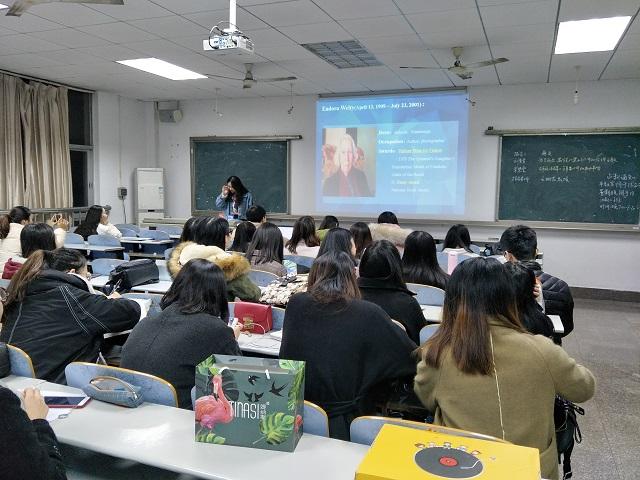主持人刘立新对到场嘉宾进行简单介绍之后,宋慧雯同学开始了以“尤多拉·韦尔蒂《金苹果》中的全力书写”为主题的学术报告会。她首先对所研究的作品及作者进行简单的介绍。接着,宋慧雯同学借助福柯提出的“权力力学”理论对尤多拉·韦尔蒂《金苹果》中的全力观进行分析,她主要从权力对肉体的施暴、权力对生活的监视以及权力对话语的规训三个方面来分析弱势女性和男性。