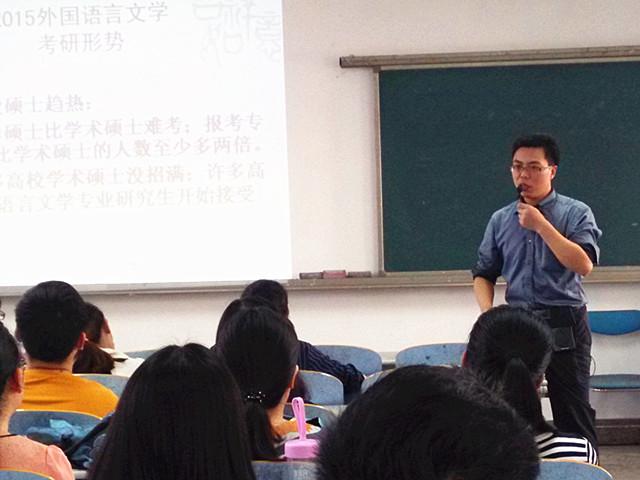 为了进一步提高公司员工的考研热情,明确考研目标,增强考研斗志,2015年10月17日下午15:00,副经理张景华在外语楼411教室主持召开了主题为“2016外国语言文学专业考研形势分析”的专题讲座,公司外国语言文学专业有志考研的同学参加了本次讲座。