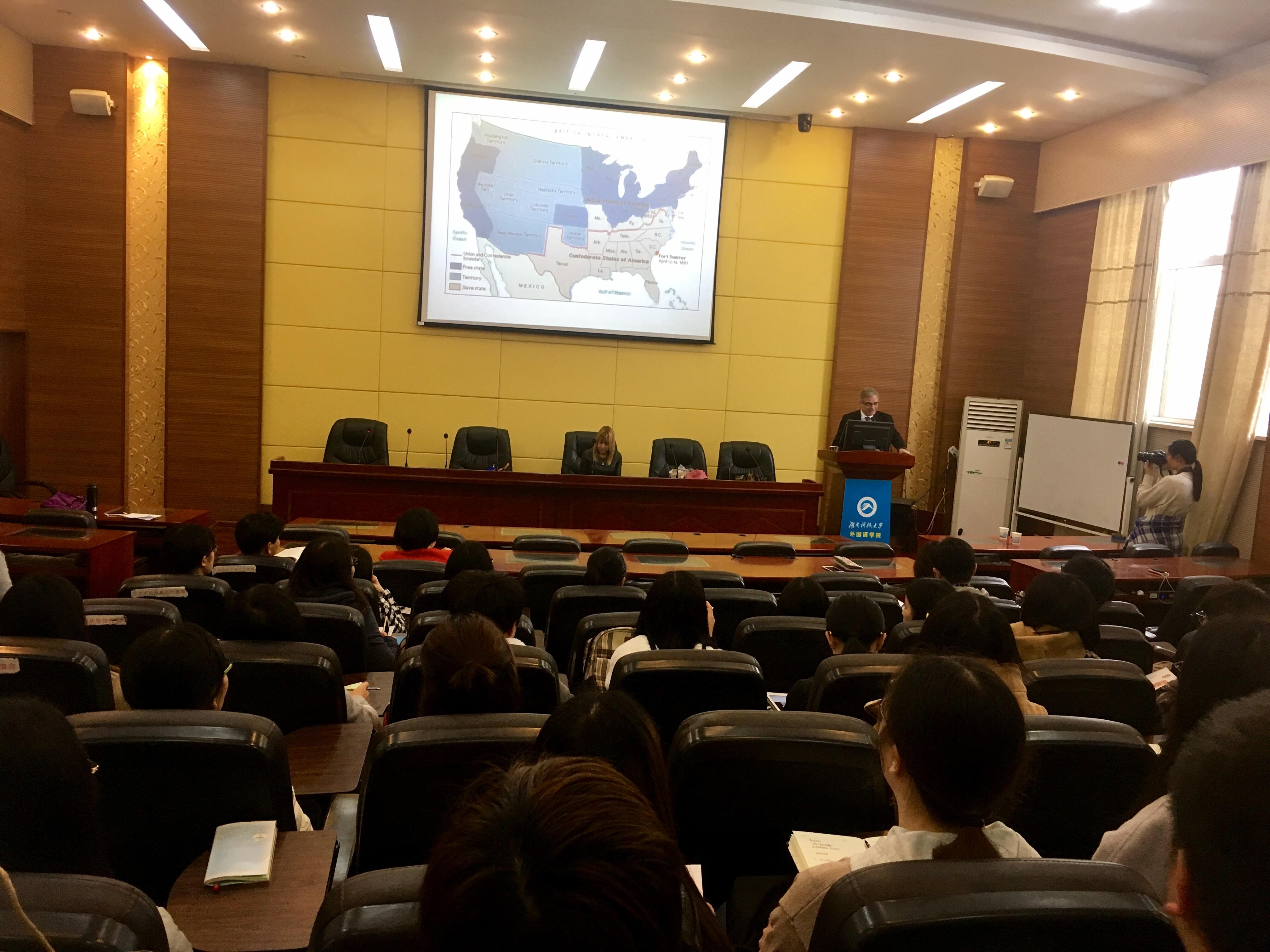 3月29日下午2:00,云南师范大学客座教授Martin Ramey教授应永利3044noc邀请,在外语楼101室为外国语师生做了一场以“The Myth of the Lost Cause After the American Civil War”为题的学术讲座。此次讲座由永利3044noc刘白博士主持,永利3044noc15级、16级外国语言文学专业研究生及部分青年教师到场聆听。