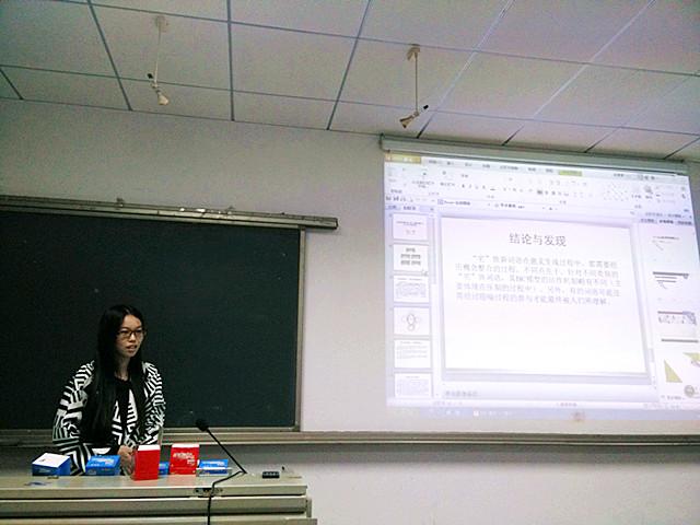 第二位做报告的汤萍同学以“基于BC模型的‘宅’族网络新词认知机制研究”为题,给予在座师生另一番收获。首先,她对概念整合理论和压制理论做了简要介绍,并分析了两者的优缺点。接着,她详细阐述了基于概念整合理论和压制理论的BC模型及其运作原理。然后,她通过深入剖析“宅青”处于BC模型下形成的每一个细节向听众展示了“宅”族网络新词语的生成过程。最后,她总结了自己的研究及论文的不足之处。