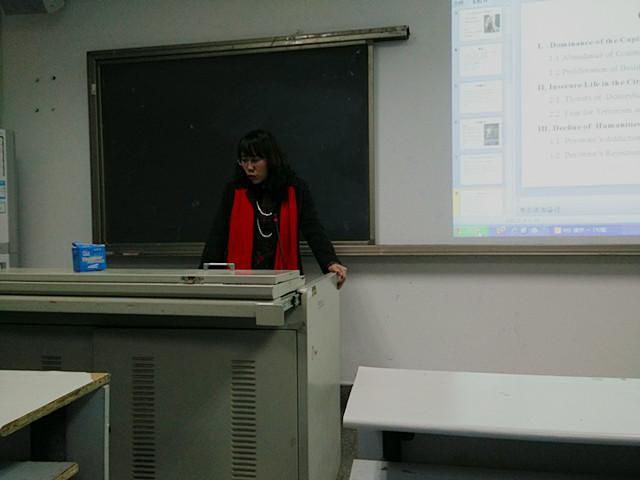 接着,刘璐同学从后工业化城市的危机书写角度解读了伊恩·麦克尤恩的《星期六》。首先,她对作家伊恩·麦克尤恩早期求学经历、作品及《星期六》的故事梗概进行了简单介绍。然后,她引入了后工业化概念,并从三方面论证了后工业化的城市危机。最后,她表示城市的危机归根结底就是人的危机,因此我们不可小视城市危机。三位同学语言生动诙谐、娓娓道来,给在座同学做了良好示范。