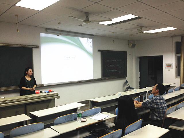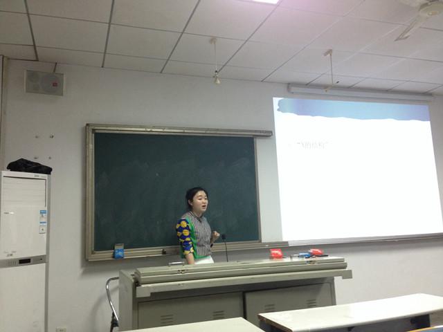 文静同学以《评价理论视角下陶渊明诗歌三个英译本对比研究》为题开始了本次的报告会。她首先简单介绍了评论理论的基本框架,评价系统就是一整套运用语言来表达主观态度的资源系统,包括三大系统:态度,介入和极差。然后重点论述了态度系统,判断系统和鉴赏系统的区别与联系。她认为此次研究对于目的语读者在判断译本好坏方面具有一定的意义。然后, 黄茜芸以《汉语政治类新词的认知语义研究》为题从认知语义角度向在座师生展示了她的研究成果,她阐释了概念整合是探索意义构建、信息整合的理论框架,是人们认识世界,形成思维和语言发展科技的一种普遍存在的认知方式,我们学习认知语言学主要是发掘概念合成过程中的各种原则和机制。最后彭蕾同学从转喻认知机制探索了文学作品中“x的”称谓语的特征。她把“x的”结构分为三大类:亲属、职称称谓语,含姓氏称谓语和表示生理、职业等特点的词语,其次她举例分析了邻近性和凸显性的差别与相关性。
