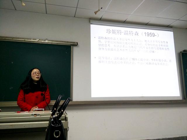 报告人何颖同学从福柯的身体理论视角探析了《写在身体上》中的身体书写。首先,她简要介绍了作家作品、创作背景、主要人物及外界评论。接着,她分析了福柯的身体理论及自己论文的框架结构。最后她从露易丝备受压迫的身体及英奇勇于反抗的身体这两方面详细阐述了作为斗争场所的身体。