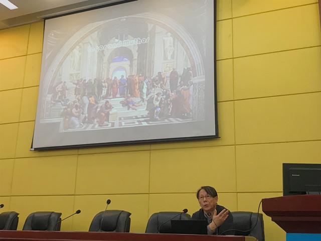首先,耿教授简单介绍了《俄狄浦斯王》的作者索福克勒斯及其生活的时代背景,并且提到当时希腊最为流行的一个观点——神人同形同性说,从中说明当时神的创造和艺术家的创造之间的同构关系。接着,他以图片呈现的方式向听众展示了《俄狄浦斯王》里面的重要情节以及家族关系。然后,耿教授介绍了各个时代对这部经典的阐释。罗马人改变了希腊人对《俄狄浦斯王》的基本认识,将这部戏剧看作是追寻知识和真理的宣言。文艺复兴时期,《俄狄浦斯王》被音乐家带入了一个新的领域。18世纪的新古典主义者德莱顿、伏尔泰等人又对俄狄浦斯这一角色进行了再创造。到了19世纪,黑格尔最终确立了《俄狄浦斯王》在哲学史上的崇高地位。进入20世纪,这部著作成为许多人讨论、创作和演出的对象。法国作家安德烈•纪德所写的小说《忒修斯》为读者了解《俄狄浦斯王》打开了大门,奥地利心理学家弗洛伊德提出了俄狄浦斯情结,将这部作品引入到了心理学领域,而他的好友达利也画了著名作品《俄狄浦斯情结》。在电影界,帕索里尼拍摄的《俄狄浦斯王》将不同的时代完美结合起来,希区柯克拍摄的《爱德华大夫》用精神分析的方法展示了俄狄浦斯里面割眼这一经典情节,而布努埃尔拍摄的《一条安达鲁狗》则是现代主义者对《俄狄浦斯王》的诠释。最后,耿教授介绍了近年来《俄狄浦斯王》的戏剧表演,包括2003年一场在伦敦桥下的露天演出,该演出试着恢复古希腊户外演出的表演形式;2010年浙江京剧团改编的《王者俄狄》;2014年日本演出团以能乐形式改编的《俄狄浦斯》。意大利戏剧导演卡斯特鲁奇于2015年再次将这部经典搬上舞台,还在情节设计和舞台布置上融入了基督教的元素。