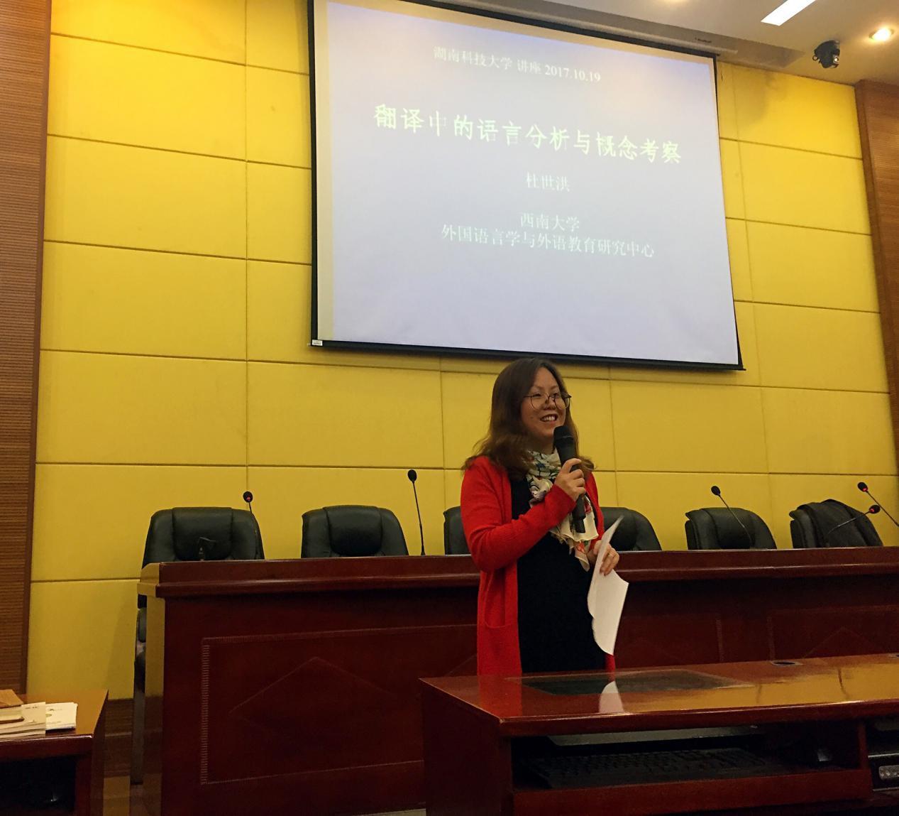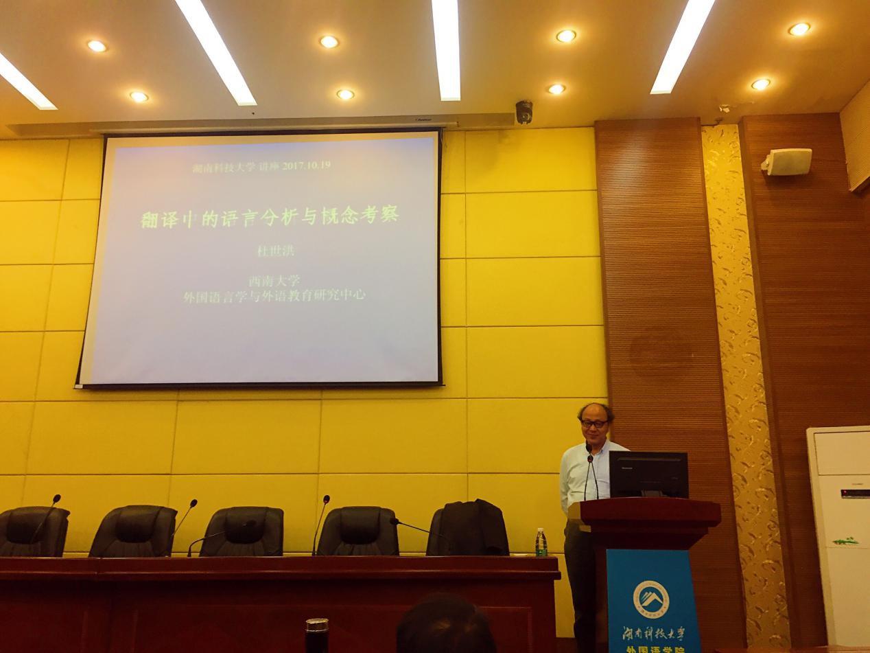 10月19日晚上19点30分,西南大学永利3044noc教授、博士生导师、博士后工作站导师、美国弗里曼学者杜世洪教授应公司邀请于永利3044noc101会议室作了一场题为“翻译中的语言分析与概念考察”的学术讲座。此次讲座由永利3044noc王桃花副经理主持。