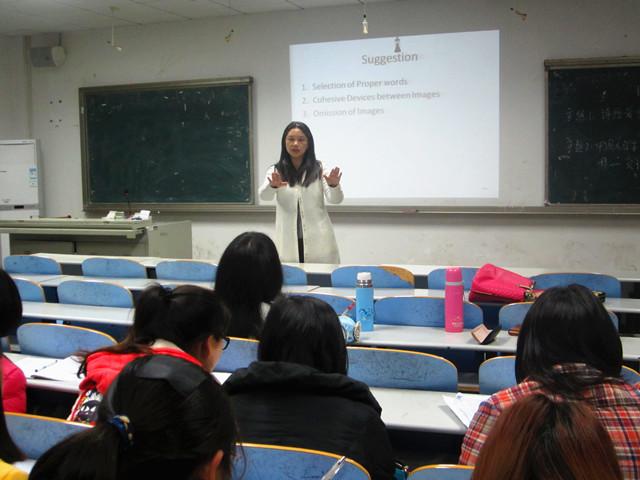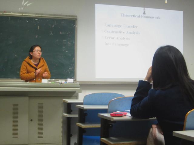 论坛由崔在平同学的“诗经爱情意象翻译对比分析——读者和译者期待视野融合”拉开序幕。论坛报告人崔在平同学首先对诗经中爱情意象的特色及期待视野的相关知识作了简要介绍。然后,以《关雎》、《蒹葭》、《椒聊》中理雅各和许渊冲的译本为例,对诗中意象的翻译进行详细的对比分析。最后,崔在平同学基于此次意象翻译的研究, 给译者提出三点建议,即:选择正确的词语来表达意象;注意意象间的衔接;如遇难懂的意象,可直接将其省略或换为熟悉的意象。接着,赵静同学做了题为“中国老员工写作中的母语负迁移——文理科对比研究”的报告。赵静同学从论文结构、理论框架、语料收集和分析结果四个方面进行论述,重点对其语料收集部分做详细讲解。最后,赵静同学表示,通过数据统计和分析,发现在母语负迁移的影响下,文、理科同学在写作上所犯的错误存在很多不同点,但也有其共同之处,即:在词、句子、篇章方面所犯的错误偏多,而且文科同学在复杂长句的运用上,比理科同学进步大。