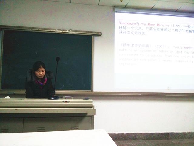 第二位报告人陈云芳同学以“模因论视角下中医术语翻译研究”为题,使在座师生获得了另一番收获。首先,她介绍了模因论的定义、类型及核心概念。接着,她在论文主体章节详细陈述了语言模因和文化模因的概念及类型,并举实例予以解释说明。最后,她从同化、保持、表达及传播四个方面细致地分析了模因论视角下的翻译过程,并用生动的例子证明了模因论视角下中医术语翻译研究的可行性。