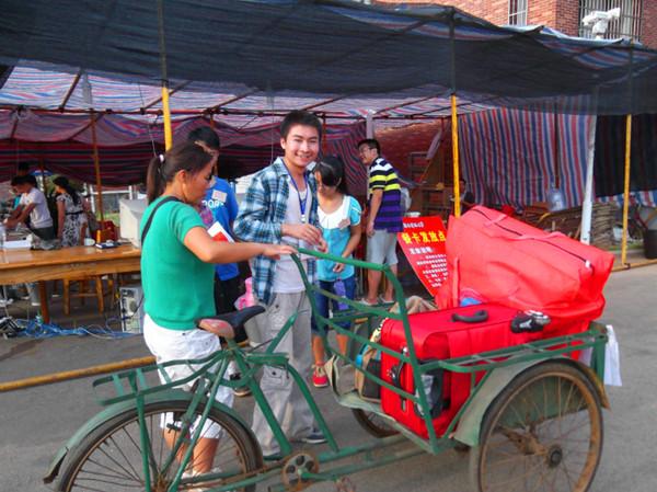 11级对外一班赵吉云已经在迎新站点忙碌了一天,不知流了多少汗水,深色的T恤背后留下了大片大片的汗渍。“我是学长呀,帮助新生是应该的,再说我来的时候也受到了热情的接待,要继续发扬永利3044noc的传统。”说完,他一抹快要滴下来的汗珠,继续帮着学妹学弟拖行李。