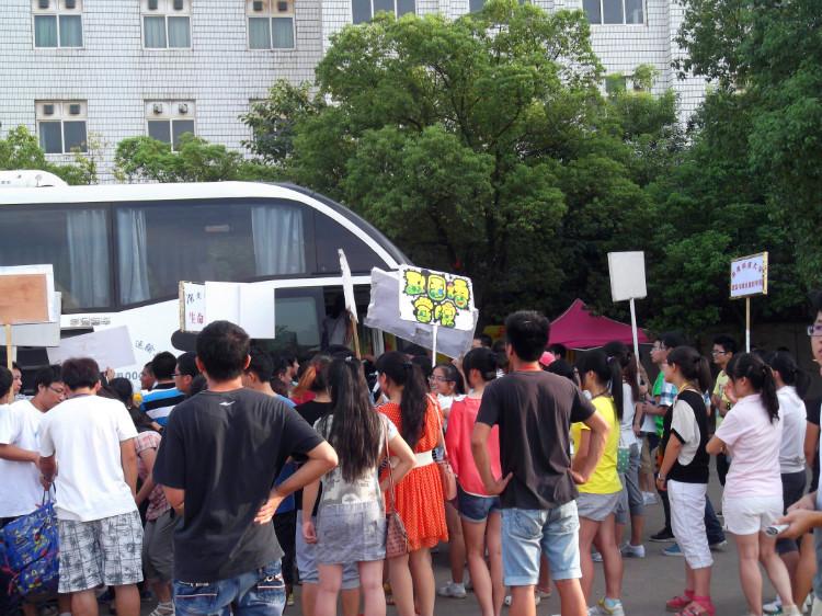 “快点,快点,举牌子,来了,来了”、“一二三,外国语”整齐洪亮的口号声此起彼伏,迎新的车辆刚停在操场上,前来迎接的同学就一边高举着外国语的牌子,一边拿着扩音喇叭大声呐喊。