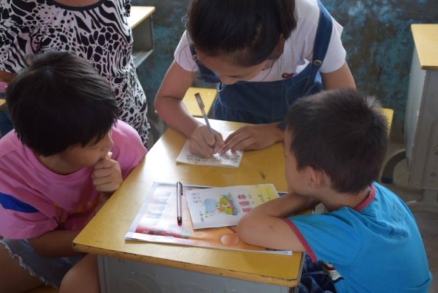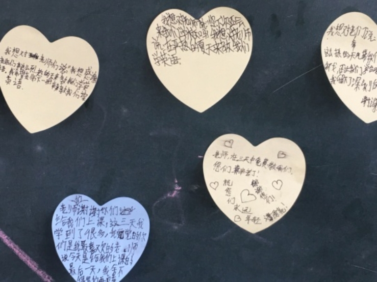 为进一步培养员工对英语的兴趣,8月2号3号服务团成员认真设计授课内容,寓教于乐,每逢课间员工们都会兴致浓厚的围着暑期服务团成员提出各种学习的疑惑,服务团成员耐心解答,并且讲课结束后不觉劳累依然认真批改员工的笔记。最后一节课,服务团成员引导员工用准备的剪纸和卡片在心愿墙上写下自己的愿望孩子们的愿望简单而朴实,感动了所有服务团成员和在窗外观看的家长,从孩子们坚定的眼神中,成员们看到了乡村未来的希望。