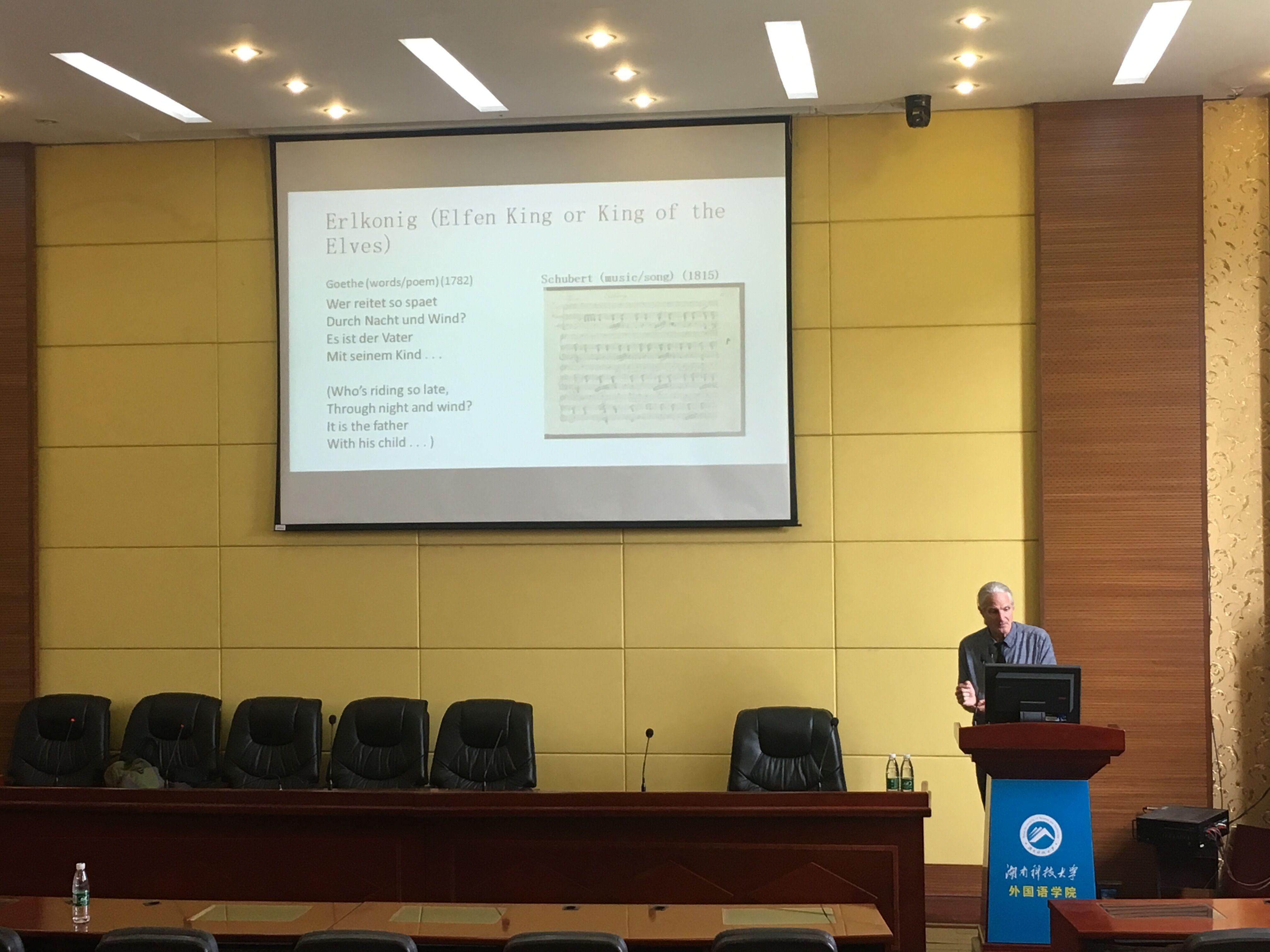 Lee Schweninger教授首先介绍了浪漫主义与启蒙运动之间的联系与区别,并以Goethe的一首诗歌作为浪漫主义诗歌的开场。诗歌中的父亲因为缺乏想象力间接导致了孩子的死亡,引出想象力的缺失是一场事关生死的博弈。他的讲解图文并茂、深入浅出,引导同学们进入浪漫主义时期那充满想象力的诗歌世界。他对美国浪漫主义作家 如:Edgar Allan Poe, Nathaniel Hawthorne, Henry David Thoreau, Emily Dickinson的诗歌作品做了分析,让同学们更进一步地明晰了诗歌中想象力的重要性。想像具有创造性,它可以创造Emily Dickinson心中的大草原,可以测量Walden湖的湖底。想象就是现实的再现。他的讲座既有学术深度,又风趣幽默,其中时常夹杂着意象诗人的逸闻趣事以及他自己的经历。