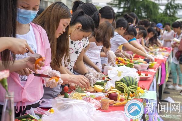 活动正值母亲节,有很多班级就以母亲节为主,做出充满爱意的水果拼盘。13级商英(3)班用木瓜、梨、圣女果和黄瓜拼出了一个立体的手持鲜花的人,晶莹剔透的提子拼出可爱的兔子,意为“致美丽的你——我的妈妈”。14级汉语国际教育(1)班,镂空的西瓜中摆满五颜六色的水果和苹果拼出的可爱小人,香瓜雕成扬起的帆插在“船上”,寓意“五彩青春 扬帆起航”。各种创意与寓意层出不穷,独特的设计,精致的拼盘让观赛的人不住惊叹。