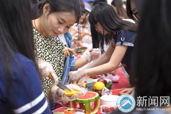 外语楼前摆着长长的比赛桌,五彩缤纷的水果占领着自己的领地。外语楼前站满了观赛的人。14级参赛队伍热情高涨,不仅有自制的班牌,还有“汉教一班 拼盘最棒”“花样青春 拼装梦想 盘点人生”等各种各样的DIY创意海报更添青春姿色。
