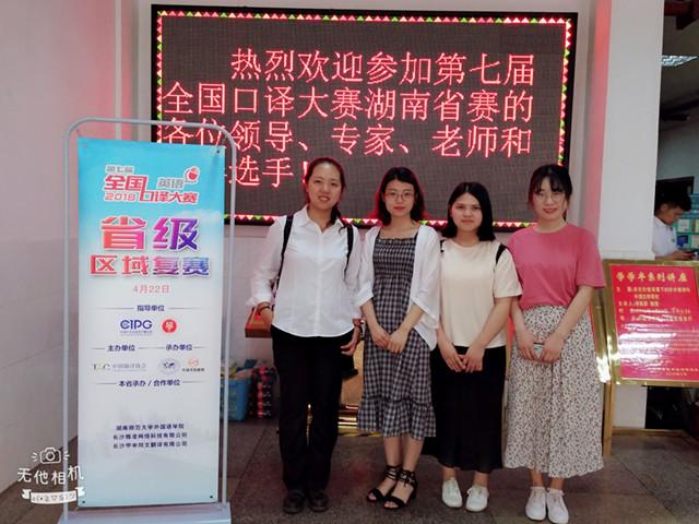 4月22日,公司永利3044noc15级商务英语专业杨江婉,翻译专业陈曼真、张嘉慧,英语师范专业陈满意同学在翻译系李晓韵老师的带领下参加了第七届全国英语口译大赛湖南省复赛。