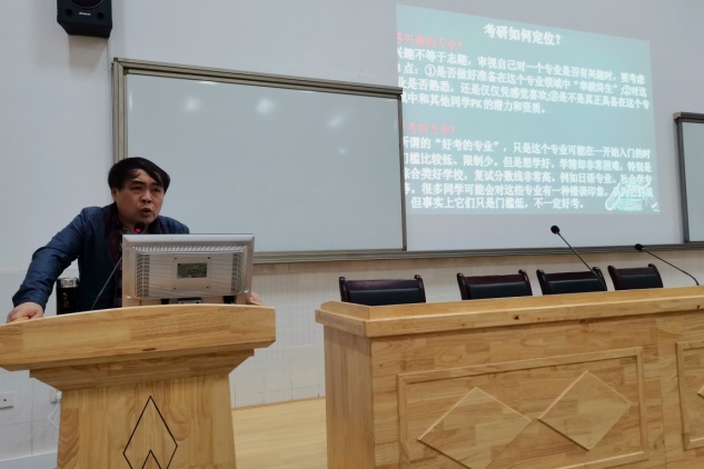 大会在掌声中正式展开帷幕,旷战老师首先分析了考研如何定位,他分别从专业与院校的选择,专业选择的误区,选择专业的侧重点等几个方面向同学们提出了建议。他提出同学们在选择专业和院校时,要注重考虑未来的职业发展和院校的竞争难度。旷战老师还提醒了同学们不要被专业选择的误区所误导,一定要选择适合自己且自己在此有一定有潜力和资质的专业。同时,他也鼓励同学们要勇于挑战,奋力拼搏,积极表现。旷战老师表示只有进行准确的考研定位,才能找到正确的方向和目标,他希望同学们都能理性地做出正确的选择。