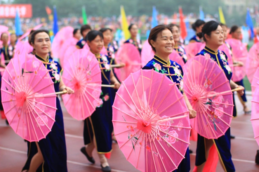 在观众的热切期盼下,方阵队、彩旗班、健美操队、各公司的代表队和教师职工队随着主持人的激昂报幕依次进场。主席台对面的观众席上,红衣黑裤的摆字方阵摆出了“我爱你中国”字样,彩旗班围绕操场站立,旗面迎风飘扬,健美操队员捧花一字站开。