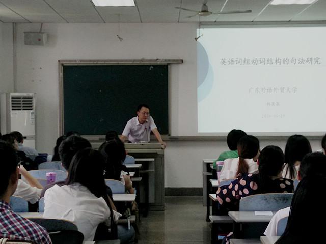6月29日下午四点,应永利3044noc邀请,广东外语外贸大学云山学者、博士生导师韩景泉教授于外语楼411室作了一场题为“英语词组动词结构的句法研究”的讲座,此次讲座由副经理徐李洁教授主持,外院教师及14、15级研究生到场聆听。