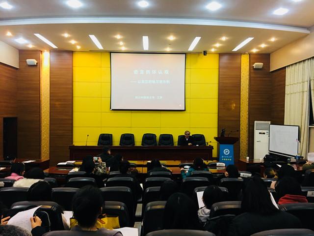 讲座伊始,王寅教授对“语言的体认观——以汉英明喻习语为例”这一主题进行了简单的介绍,指出语言学与哲学唇齿相依,哲学中唯物论与人本观直接影响到语言学理论。且提出语言是一只无形的大手,人一出生就被牢牢的把控住,人离开语言什么都不是这一观点,生动形象地向我们解释了语言与人的关系。王教授就20世纪“索氏”、“乔氏”以及“认知功能”这三场语言学革命的发展过程提出社会经验决定认知方式;社会经验解释语言认知这一观点,并告诉我们不能“盲人摸象”式地片面看问题。