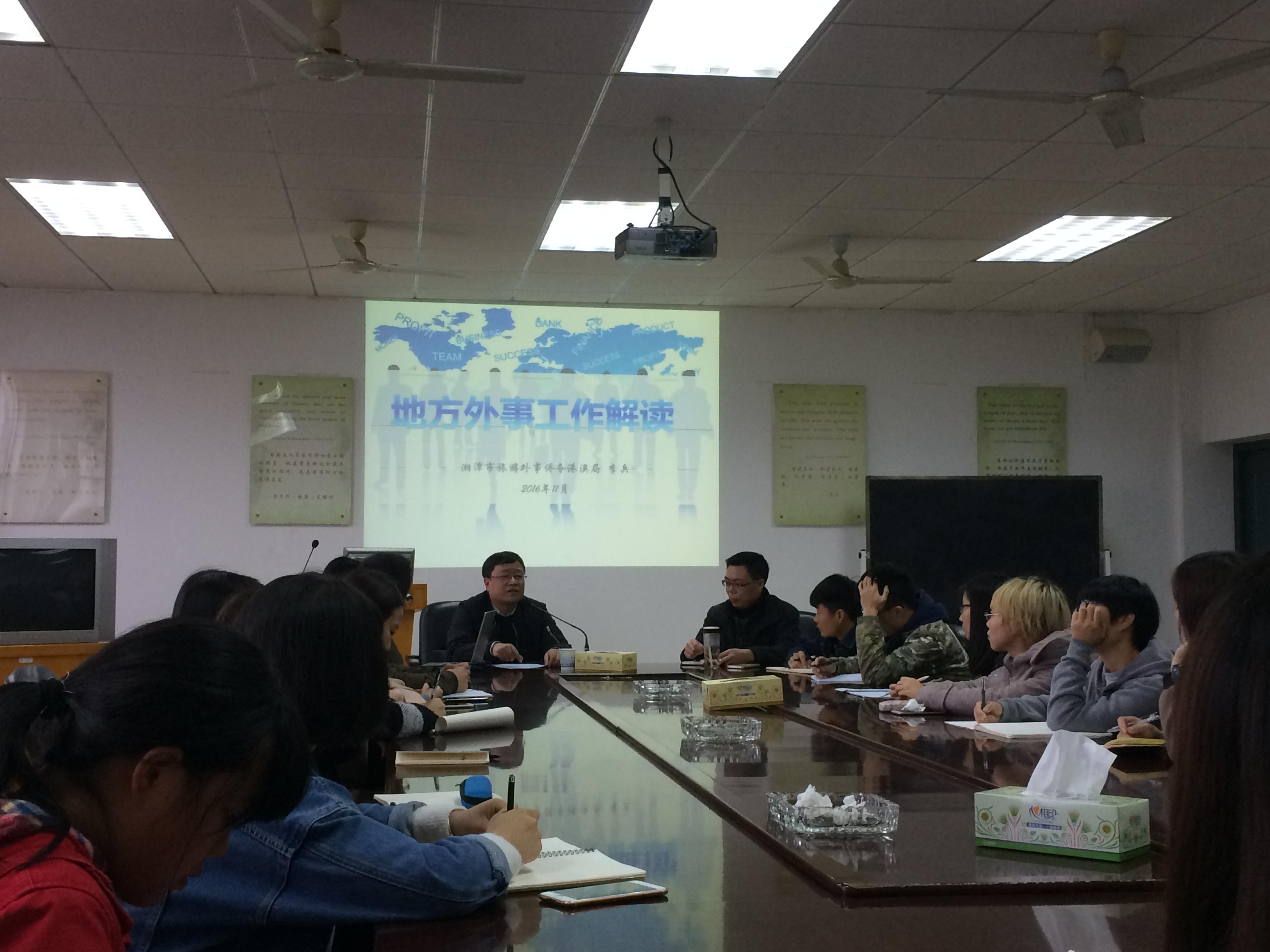 2016年11月8日下午3点,湘潭市旅游外事侨务港澳局副局长李兵应邀在外语楼311会议室作了一场题为“地方外事工作内容与意义”的专题讲座。讲座由永利3044noc副经理张景华教授主持。永利3044noc16级研究生到场聆听了讲座。