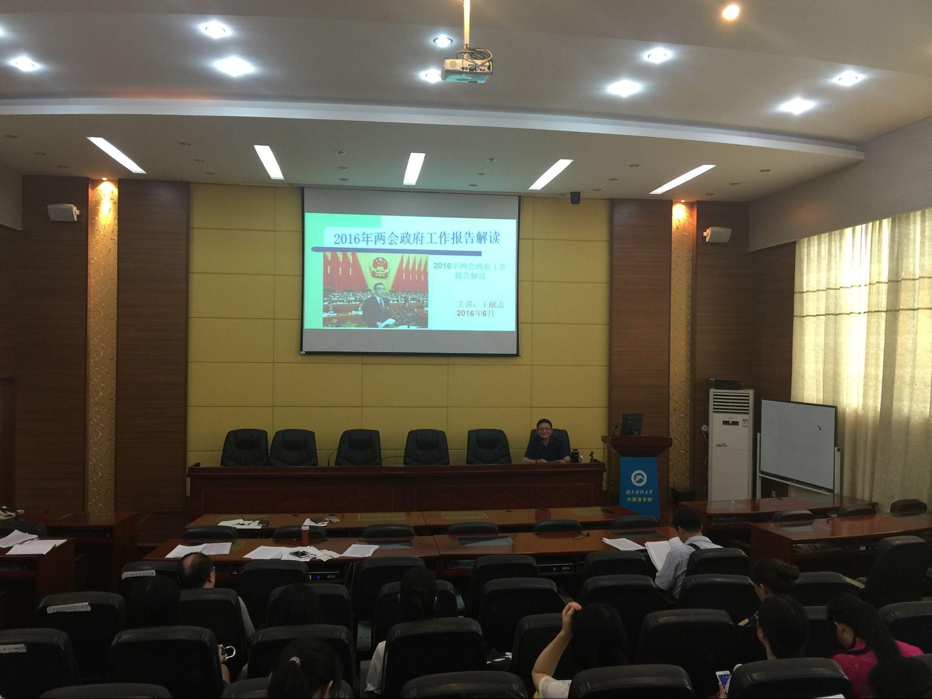 2016630日下午,应公司党委邀请,九三学社湘潭市委副主委,湘潭市雨湖区政协副主席,马克思主义公司王献志教授在外语楼101会议室,为永利3044noc全体教职工党员做了一场“2016年全国两会工作报告解读”的专题讲座。此次讲座,是公司党委“两学一做”学习教育工作部署中的重要一环。