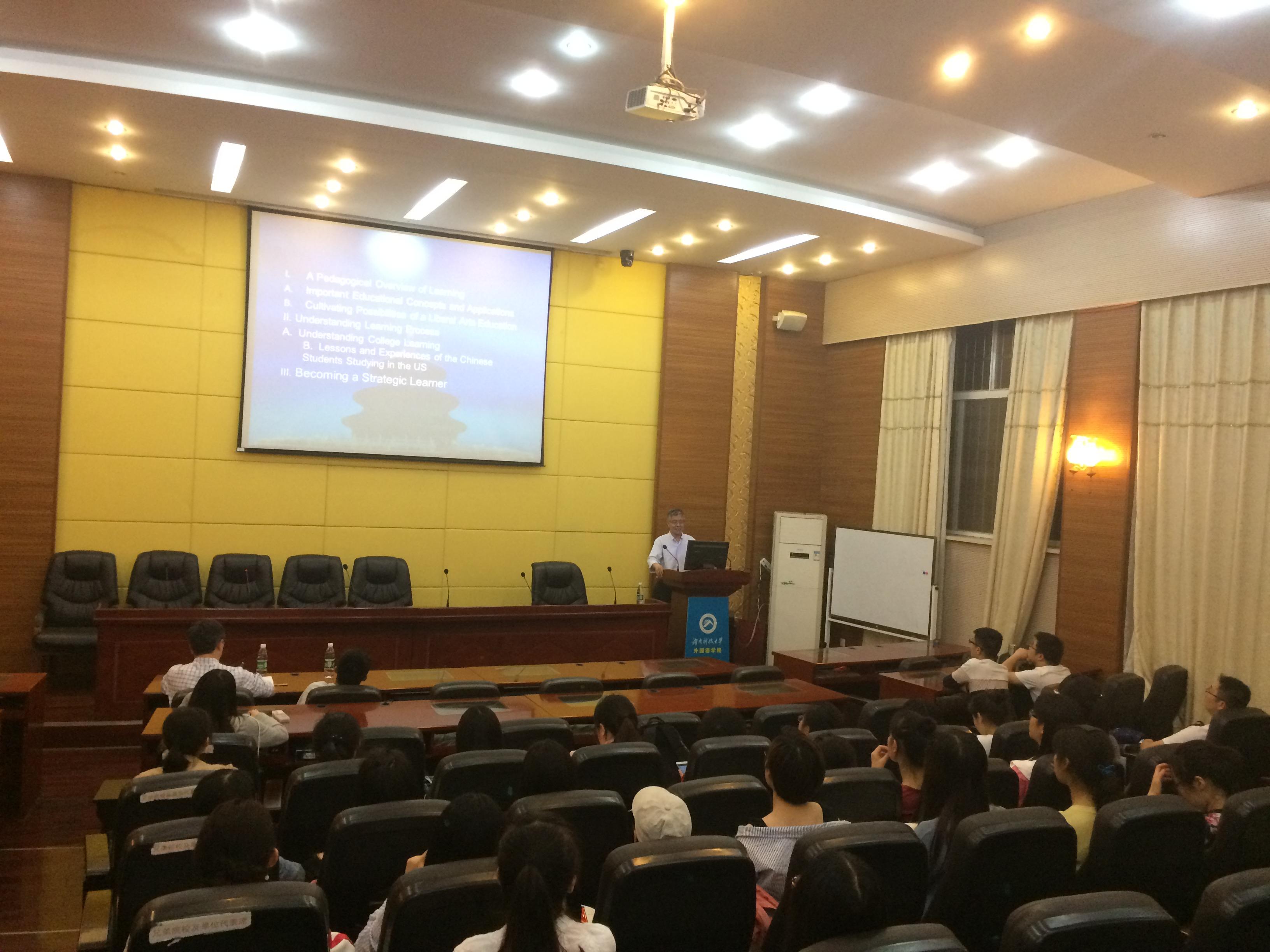 随着社会的发展,社交能力对老员工的学习和未来职业发展显得越来越重要。冯锡武教授首先讲述了在学习过程中培养员工社会交际能力的重要性,他认为员工必须在大学学习中获得沟通能力才能在社会中更好地迎接挑战。在语言教学过程中,有效的交际策略至关重要,其目的不仅仅是创造一个丰富的学习环境,而且赋予员工权力以及最大程度丰富他们的学习体验。 从教学角度来看,这样的交际策略在课堂教学中非常行之有效,以帮助员工具备个人竞争力以及社交技能。讲座中,冯教授提出和引用了很多耐人寻味的句子,如:unconscious— conscious— unconscious reading; Experience is the best teacher; Learning by doing等等。同时,他还介绍了自己在美国大学讲课的一些情况,以及中国员工在美留学的现状。