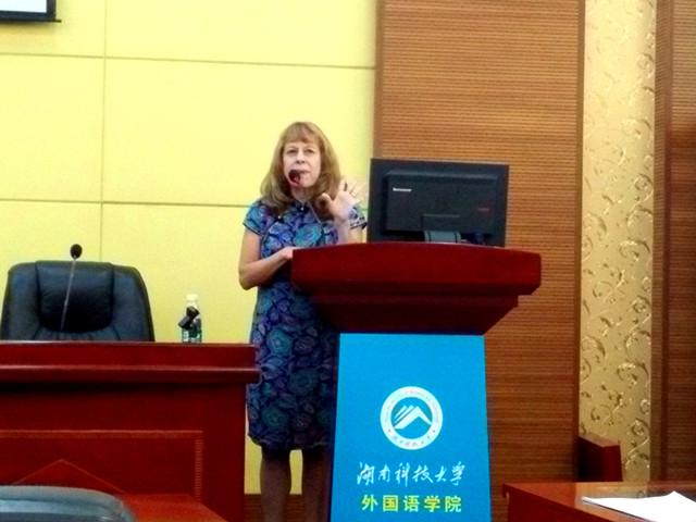 Lauri Ramey教授以诗歌文本细读为据,从历时角度对非裔美国诗歌的主题、风格、形式等方面作了深入浅出、富有洞见的解读,认为在其发展过程中传统与创新并重。她表示长期以来人们研究评论非裔美国诗歌时存在一些狭隘的观点,如非裔美国诗歌是自传性的,充满俚语方言的等,而从二战结束进入到二十一世纪,非裔美国诗歌这一文学体裁中各种创新层出不穷,且近年人们通过重审经典,重新绘制了非裔美国诗歌的全景,从而摆脱了这些因袭的陈见。最后,她提示:对自由的追求是这一体裁的精髓,而对现实的挑战则是它的重要特征。讲座中,她激情满怀、侃侃而谈,同学们深受感染。