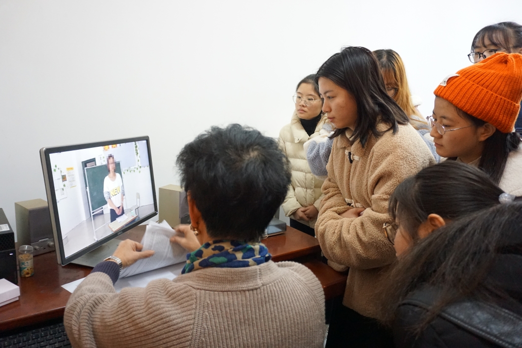 接着,徐李洁教授带领员工们在310会议室组织了现场的模拟面试,三个师范班每班由两名员工进行模拟面试,包括教育问答、上课和课后回答问题。模拟上课包括听说课、阅读课、语法课、词汇课、语音课和写作课六个课型,旨在让同学们了解和熟悉不同课型的教学模式。在每轮面试结束后,徐李洁教授针对员工的表现作出了犀利的点评。发现大家最大的不足在于回答考官问题时脉络不够清晰,缺乏逻辑性和教师代入感。她鼓励大家在面试时调整好心态,自信地展现个人风采,并注意活跃现场气氛。徐教授指出,课堂上老师与员工的互动,特别是对员工的回答做出实时评价是必不可少的。同学们也积极吸纳了徐教授的建议,现场气氛良好。