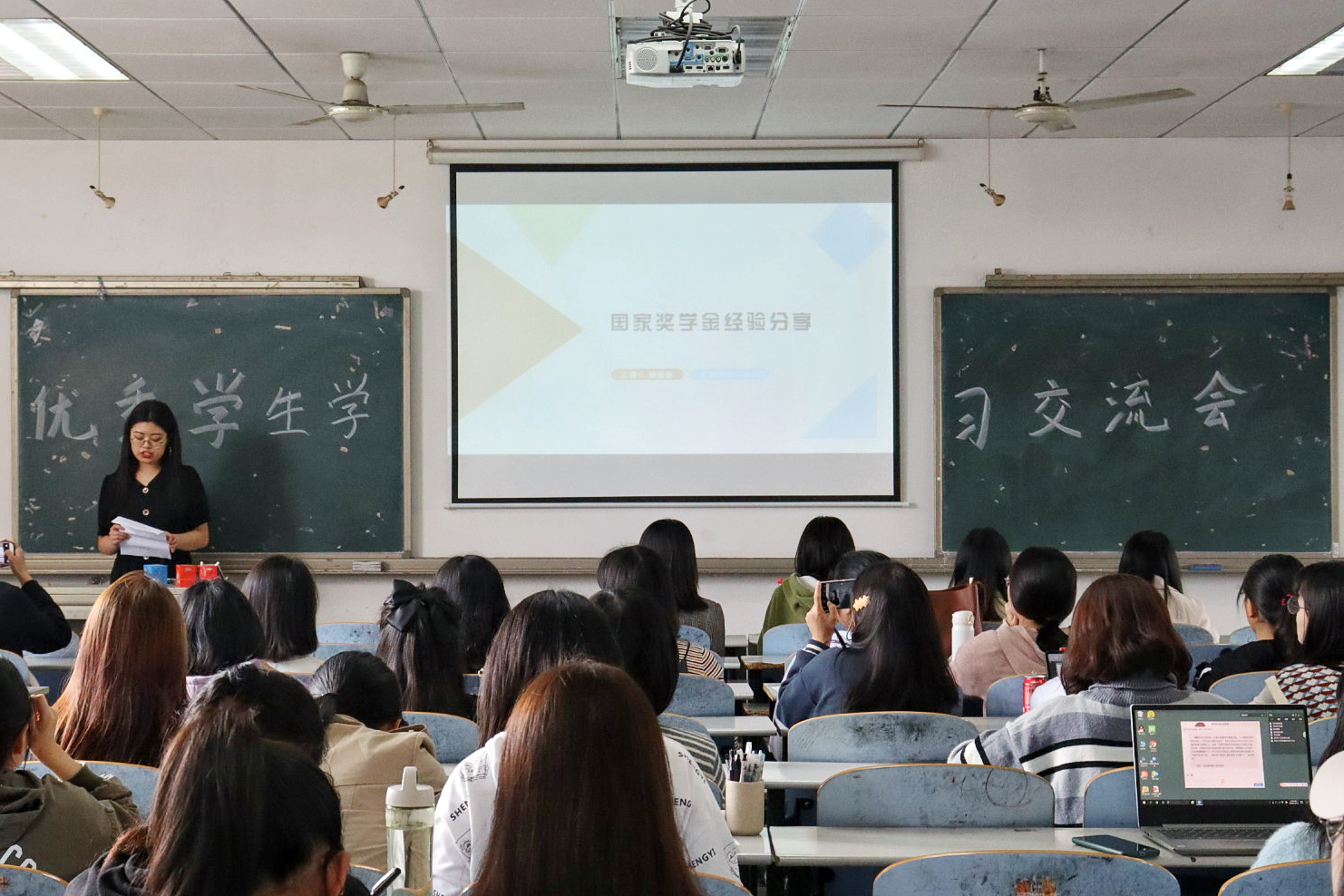 主持人宣布分享会正式开始后,几位优秀学子依次上台交流学习经验。魏思敏分享了她获得国家奖学金的相关经验,从学习、工作、思想等方面入手,层层递进,细致讲解。陈微细致讲解了自己高效率的学习方法并强调了绩点的重要性,令同学们受益匪浅。金诗玥提到了学术论文的准备方法,引起了同学们浓厚的兴趣,她还强调大学是一块跳板,鼓励同学们努力学习,奋勇向前。胡倩根据不同年级的层次,分别讲解了各阶段同学们该做的事情,提到要调整好心态,积极面对学习与生活。肖乐瑶补充介绍了利用外刊进行学习的好方法,并鼓励同学们努力学习,坚持不懈。