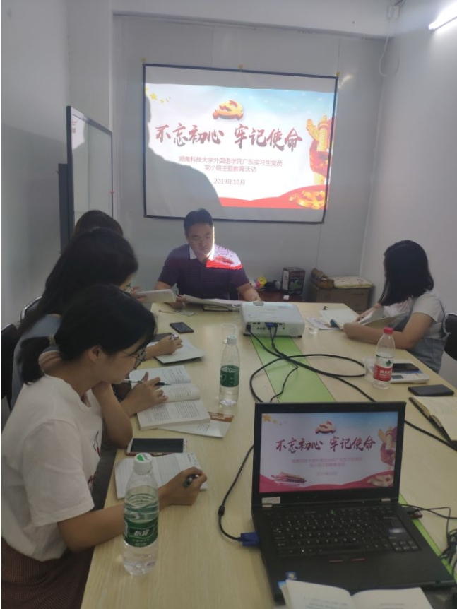 进一步落实中央、省委和学党委有关不忘初心、牢记使命主题教育的要求,实现主题教育活动全覆盖,1010外国语公司党委副书记龙赢和员工支部书记赵鹏赴广东为员工党员送党课,指导在深圳等地实习员工党员成立学习小组开展集中学习,确保在外实习员工党员开展主题教育活动的质量