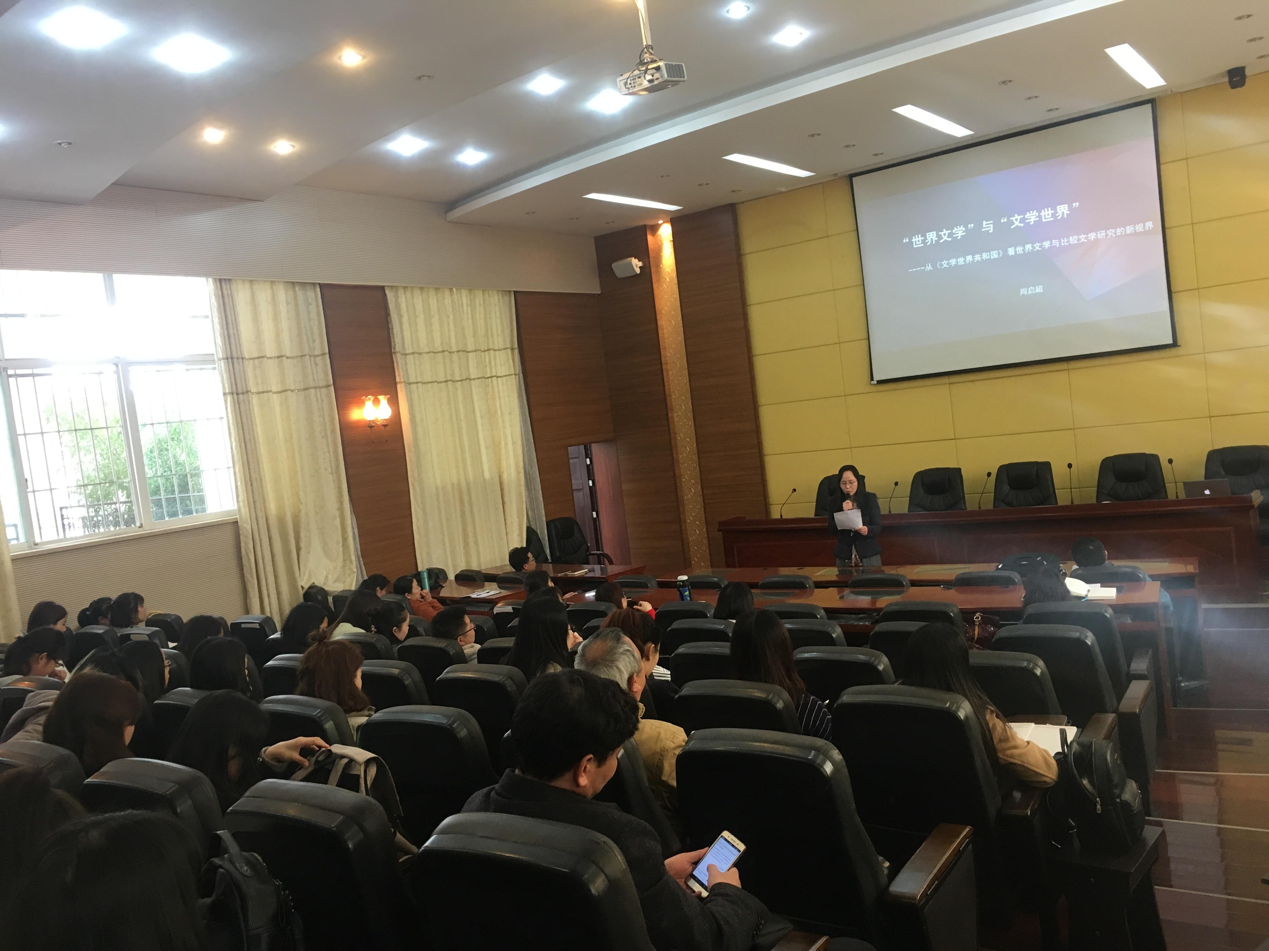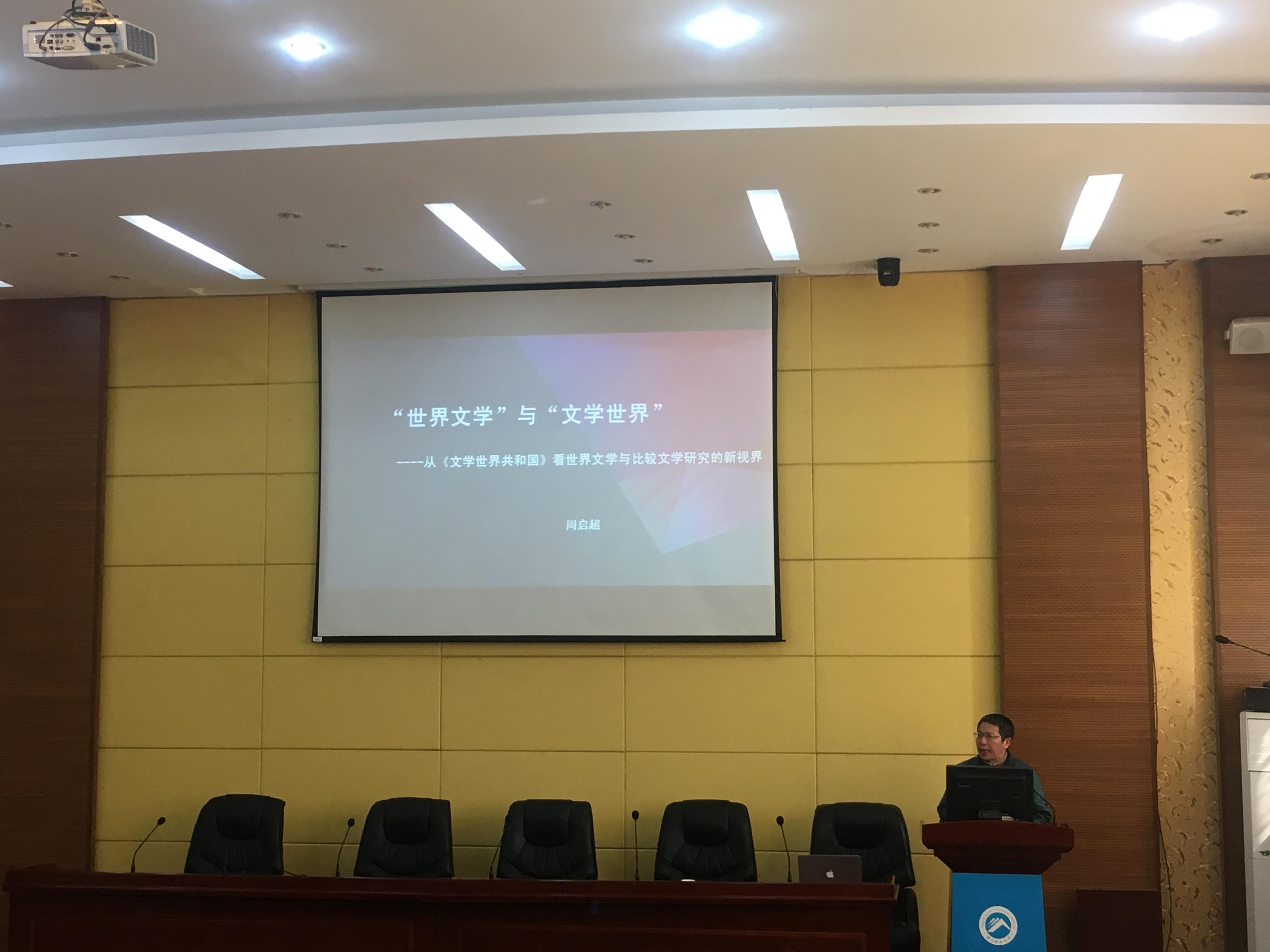 周教授首先介绍了卡萨诺瓦《文学世界共和国》一书中所体现的观点,以及外界对于其作品的评价。周教授指出该书有助于开阔“世界文学”的视野,更新比较文学的思维。继而,周教授阐述了当代文学的前沿,并就“世界文学”与“文学世界”这两个的概念进行了区分及解释。同时,就民族文学如何跻身于世界文学这一问题进行了探讨。他指出世界文学并不存在,而是正在发生,在变化,在跨文学、跨国际的条件下不断建构。因而,他进一步指出我们应以动态的模式来观察文学,文学因其自身的自主性与自立性,而不能与经济、政治划等号。最后他向各位在场的同学及老师提出了希冀,希望我们应关注多形态、多模态的世界文学,思考如何建构中国人的世界文学理念。