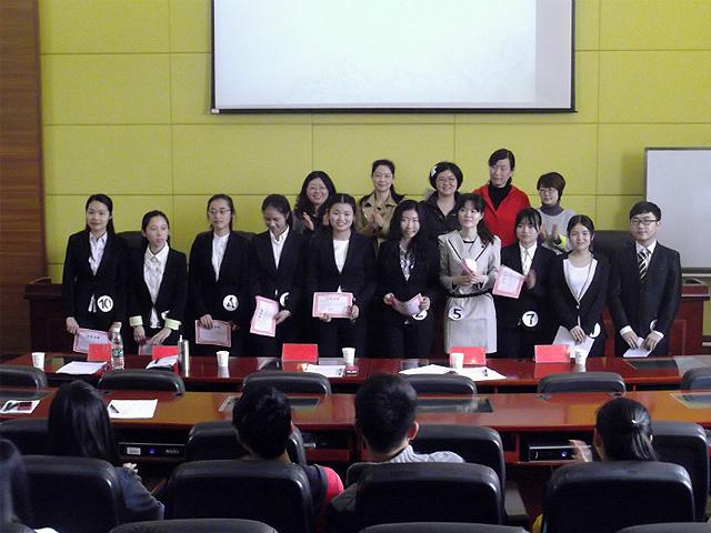 选手们始终沉着冷静,聚精会神的听着录音,翻译各有千秋。最终,10号选手王淑卿以88分佳绩夺得本次口译决赛冠军。紧张的比拼之后,凌建娥博士对选手们给予点评,指出“她们不仅要克服紧张的情绪,保持清晰的思路,还要把所听到的材料即时准确的翻译出来,这对选手的英语能力和心理素质都是不小的挑战。选手们都很棒!”最后,评委为选手颁奖合影留念,比赛完美落幕。