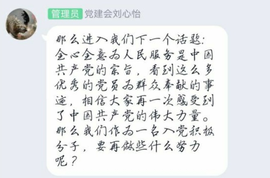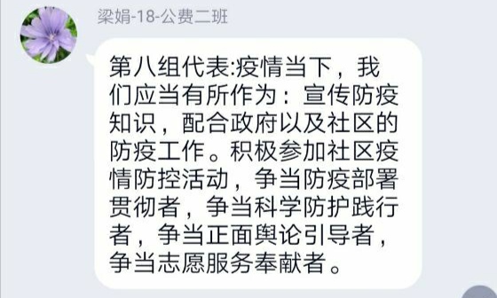 下午4:30,学员们采用小组与整体相结合的讨论方式,围绕主题“结合当前疫情,谈谈个人对党的认识”展开了激烈讨论。在讨论过程中,学员们广开思路,相互学习,结合了自身情况和党的理论知识,给出了自己的答案。
