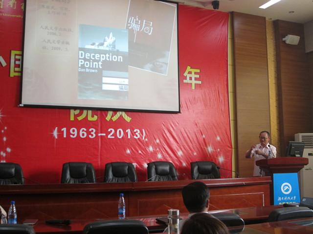 6月15日下午4:30,应永利3044noc邀请,上海大学英美文学研究中心主任朱振武教授在外语楼101教室作了一场题为“文学翻译的门径与策略——以丹·布朗小说的翻译实践为例”的专题讲座。讲座由永利3044noc副经理张景华教授主持。永利3044noc部分老师、全体13级研究生及部分12级研究生到场聆听了讲座。